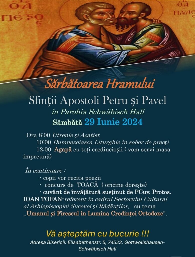 Parohia Ortodoxă „Sfinții Apostoli Petru și Pavel” din Schwäbisch Hall a sărbătorit hramul sâmbătă, 29 iunie 2024, prin rugăciune și comuniune frățească.