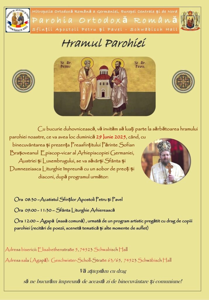Parohia Ortodoxă „Sfinții Apostoli Petru și Pavel” din Schwäbisch Hall a sărbătorit hramul sâmbătă, 29 iunie 2025, prin rugăciune și comuniune frățească.